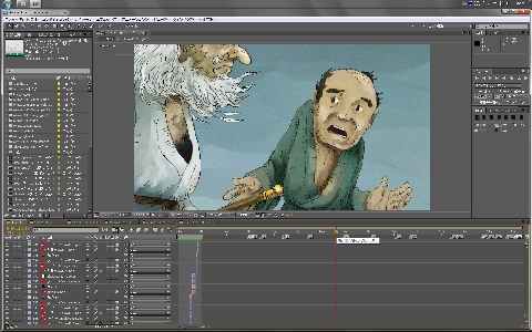 それ以外でカメラや全体が動いているシーンは素材をばらして紙に描いて、Painterで色を付け、Photoshopでレイヤー分けと若干の修正をしてAEで合成している。