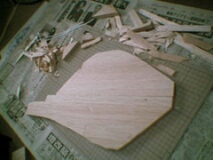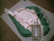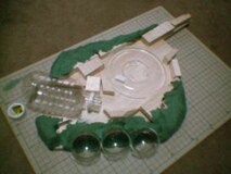 鋼鉄の形相をかましてますが、実はバルサ材です。 そこに紙粘土をもりもり盛り付けます。向かって右の透明なのはガチャポン。手前はペットボトル。向かいは紙粘土じゃなくても良かったなぁ。 紙粘土はフォルモを使用。模型屋さんや画材屋さん、DIY店など比較的入手しやすいです。 |