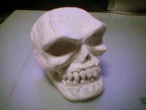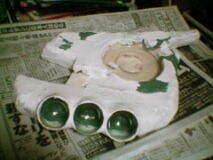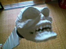 ヘッドにはヘッド。骸骨が作りたかったので作りました。猿の頭くらいの大きさ。ステロタイプなデザインをそのまま立体化したかったんですよ。 これはガチャポンにファンドで作ってティッシュペーパーをかぶせました。 本体は何気に完成しています。仕上げはジェッソを塗りたくってサンドペーパーでヤスリました。ジェッソは硬いです。粘りもあるし。 |