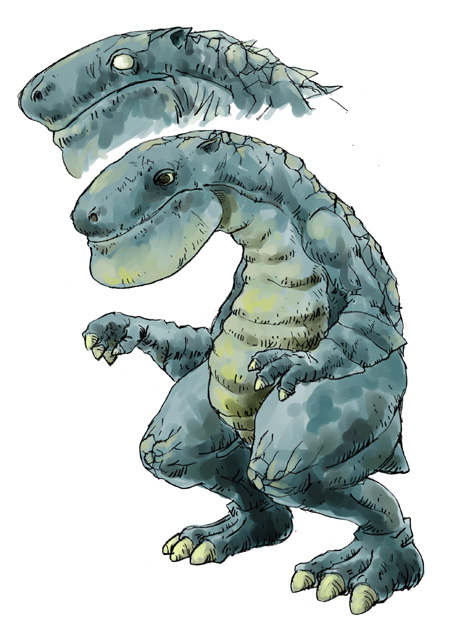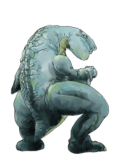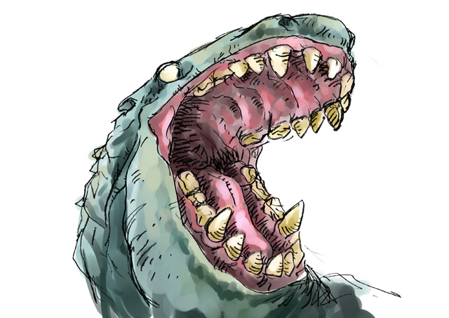象などの目を参考にしている。全然分からないよね。体が大きいことと目が大きいことは相関関係すらない無関係っぷりだ。また体に対して目が小さいと巨大感が出る。自分の目の大きさと比較するからね。顔に関しては巨大生物で巨大な顔は一般的に存在するので大きくした。鯨とかカバとか、大きいものね。体を維持する為にたくさんの食事を取るためとか、口を開けて威嚇するとかそういった理屈だ。