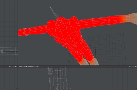 そして宇宙キッドを手直ししたのでついでにポーズをつけてポスターっぽいものを作ろうとしたら、ボーンが外れてしまい、ついでに作り直したらさらに修正が効かなくなり、ウェイトマップを作り直しているのが今。画像はボーンから自動でウェイトマップを作ったところ。これではマップの意味が無いのでちくちく修正する。ボーンの数だけマップがあるので手間がかかるのです。