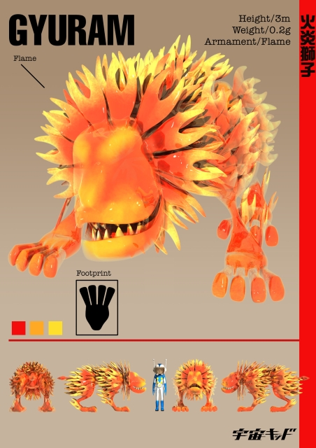 宇宙キッド ギューラムのカード風のやつ 投稿者: murbo 投稿日: 2013/08/272017/01/14 架空のTVアニメ、宇宙キッドに登場する敵怪獣。ライオンの形をした光の怪獣。全身が炎で、あらゆるエネルギーを飲み込み自分の力にする。と云う設定で、第21話に登場する。 パソコンの調子が悪くてやる気は出ず、今ひとつ作業速度が上がらない。あ~、やる気はあるんだよ、ノリノリじゃないってこと。ノリくらいだね。 次行ってみよう。 これは怪獣図鑑の第二巻に載る予定。第一巻はAmazonで発売中。 関連記事: 火炎ライオン ドーモル船 カビ怪獣の途中経過