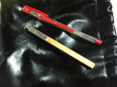 15-02-21211154この下の木製のものが自作したスマホなどの静電容量タイプのタッチパネル対応のスタイラス。作り方は何度か書いているが、角材に竹串を適当に切って刺し、透明の塩ビの様なプラスチック(ここではOHPシート)とHDDなどの包み紙になっているビニル袋を適当なサイズに切って台所用などのアルミテープで固定したものだ。角材をボールペンに変えても問題ないし、見た目は綺麗だ。でもどういうわけか突然反応しなくなる。角材版はそういうことが無い。しかし、見た目がどうしようもなくダサい。