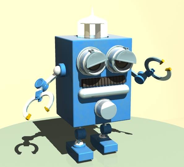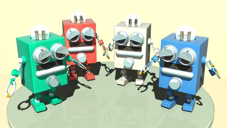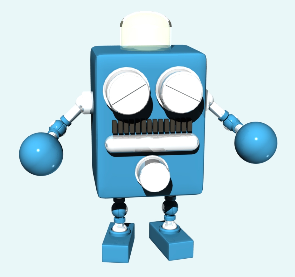 手が空いたので全体を作り直し、出足を新規に作り、目も筒の中に目玉が入っているように直し、まぶたを蓋のように作りました。頭の透明部分も真空管の写真をネットで探し、なんとなく真空管に見えるように作り直しました。これを今後設定や物語な広げたいわけではないので適当に切り上げたいが、ポーズくらいはつけたいので、簡単にパーツをペアレントしています。