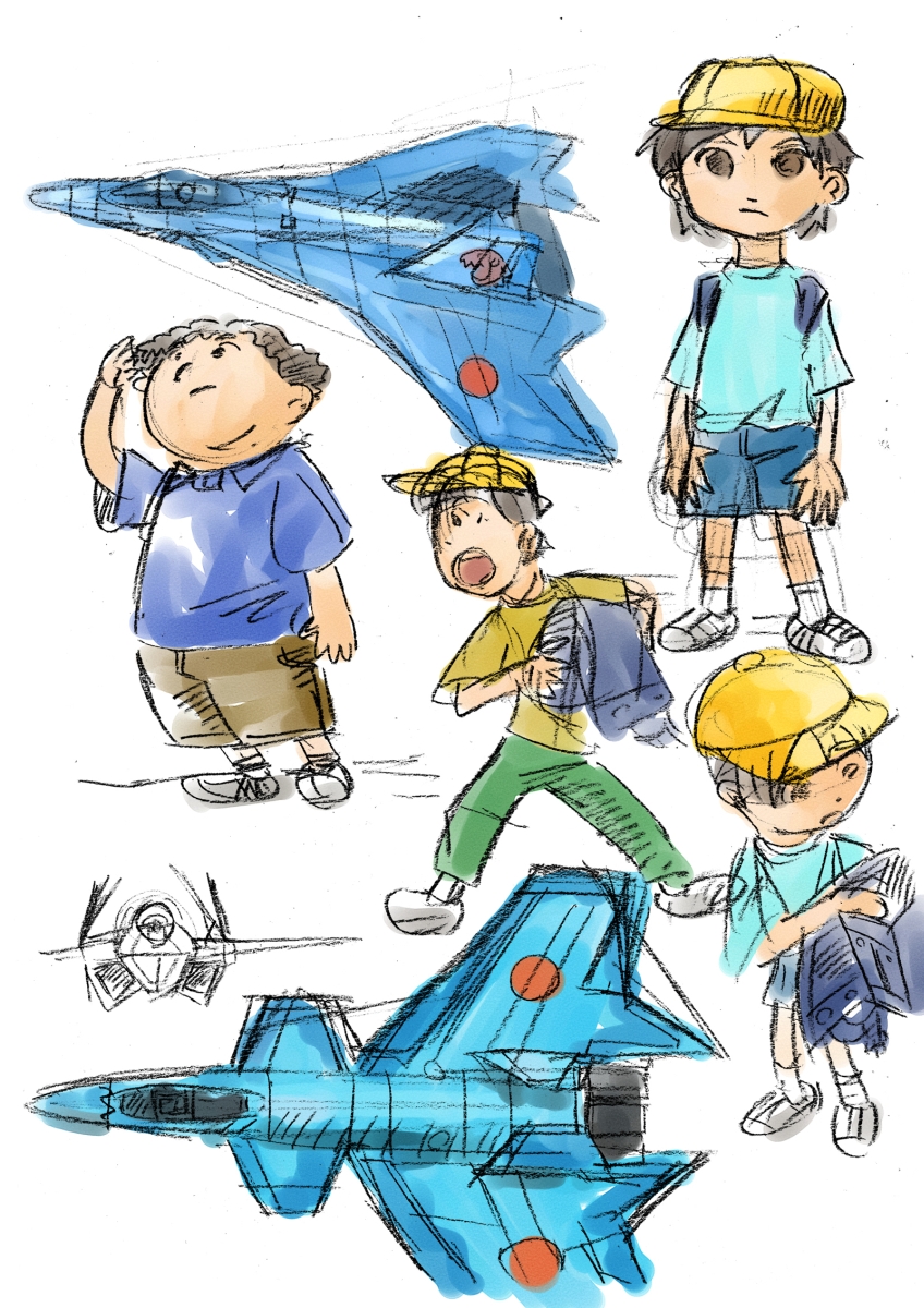 おとこのこ三人組は別の話で考えた三人。また架空戦闘機を思案中。調べるとやはり想像だけで描くと問題があった。