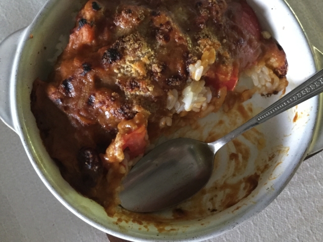 日記 ドリア風カレーライス 投稿者: murbo 投稿日: 2017/09/09 残ったご飯、スライストマト、残ったカレー、チーズの順にさらに載せ、ガス台の魚を焼くところで焼きました。 トマトの水分で硬めの粘度のカレーも食べやすくなります。毎度カレーは全部混ぜるのですが、これは熱いので混ぜずに食べる分だけスプーンで切り分けて食べています。 半分食べた状態なのは、ここまで食べ進んでから撮影することを思いついたからです。 関連記事: 昼食カレー 2019年8月2日のランチ。 ケイタイ解約した。