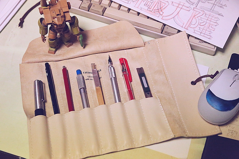 これをどう使うかと言うと、普段から全部ペンなどを格納して机に置いています。作業するときに開いて仕事中。巻いて仕事終わりとして、気持ちの切り替えにしています。また、これまでは既存のケースだったので全部入らなくて持って行くときに入れ替えていたらよく忘れ物をしていました。これに変えたら全部持って歩けるので忘れようが無いのであります。かっこいい道具が出来たので頑張って色々描くぞ。