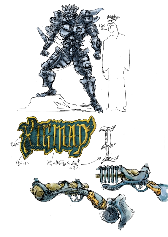 上下の絵はXIGMADをどういう風に描いたものか取り敢えず、ワーッと描いたもの。体型を気にしているのです。気にしないと瘦せ型に描いてしまうので。これだと胸が平らになってしまっているなあ。