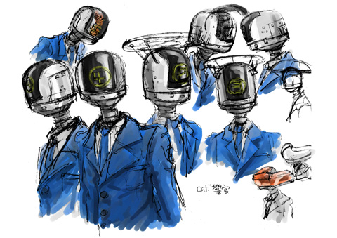 fx022891480気休めに描いた。顔面がモニタになっていて色々表示する設定だ。画面が小さいと目が詰まって綺麗に見えるが実際はかなり荒いよ。頭に丸いのが付いているのは制帽の様なものがあったら良いと思ってやってみたら、そうでもなかったので塗っていないのだ。