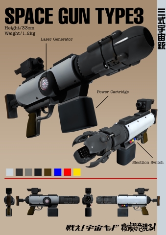 予習に宇宙キッドの全話あらすじと敵メカ怪獣を3DCGイラストの載った宇宙キッド 怪獣図鑑をどうぞ。TV版の三式宇宙銃は第三巻に載っています。