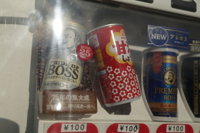 乾杯する自販機の中の缶。