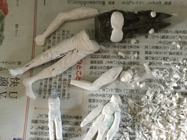 一緒に写り込んでいるのは1/35人間と、1/25位人間の作りかけ。バルタン星人のついでにちまちま作っているのだ。ざっと紙粘土を脚とか人型にして、乾燥したらバンバン削るのだ。