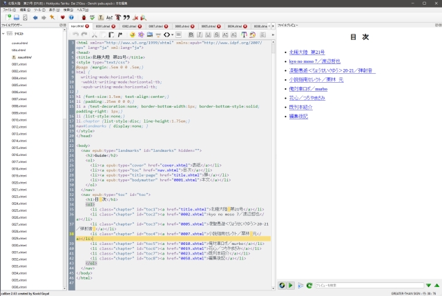 これまでちょっとというか、かなり手抜きをしていて画像だけのページに目次のリンクが張れないとか、文字のある程度の装飾も何もせずのままでした。それをcalibreでできる範囲で編集しています。文字に色を付けることもできてリフロー形式でもデザイン的に攻めていけることもあるのですが、いまだグレースケールの端末がスタンダードで存在するので、画像はともかく、文字はスミ一色のままにしようと思ってます。