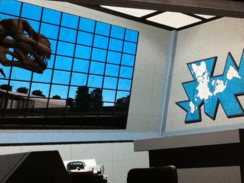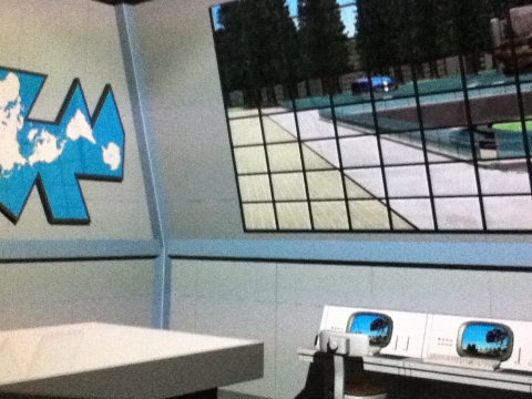部屋の後方には世界地図。ダイマクション図法を採用しました。これはインスタントに未来っぽく、かつレトロ臭くしてくれるので何よりも効果が高い。単純にウルトラセブンで採用されていたから、レトロフューチャーの認識が高くなるんだろうな。
