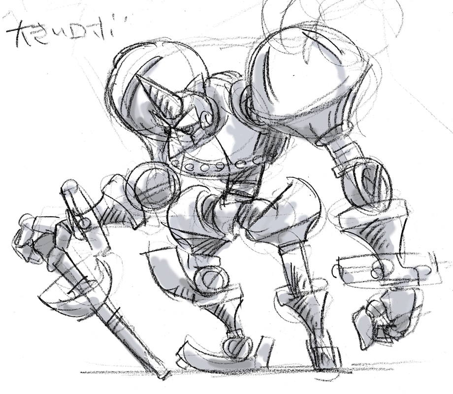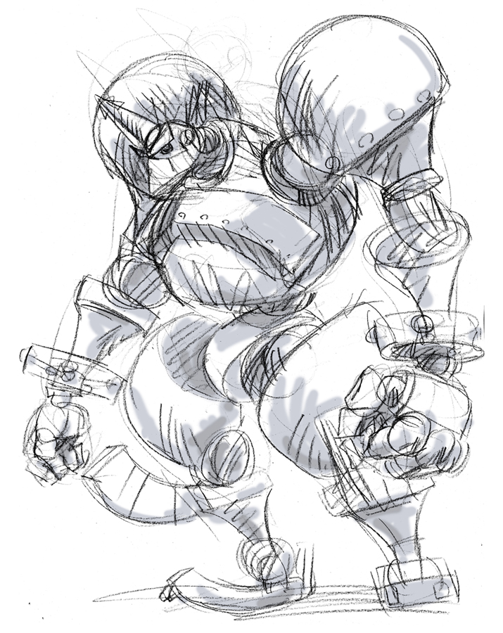 それで再度描いた大きいロボ。これで視点を変えてあおり気味に描けば大きく見えるだろう。今回も多少色がついていると寂しくならないと思って、少しだけカラーです。