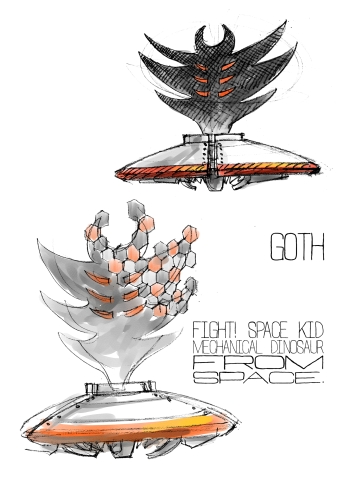 せっかくなので敵の魔人ゴースも見直す。殆ど変える気は無いが円盤部分が単なる皿状態だったので、フォログラムが出るときに四分割して開くことにした。ゴースも怪獣図鑑のときは単に半透明だったものをもっとフォログラムに見えるようにする。というのはこの絵では表現できていないので、そうしたいという希望を書いている。