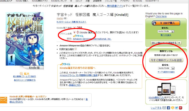 同様にAmazonのページへ行くとKindle購入価格の下にプライム会員があります。Amazonプライム会員の人は無料なのです。
