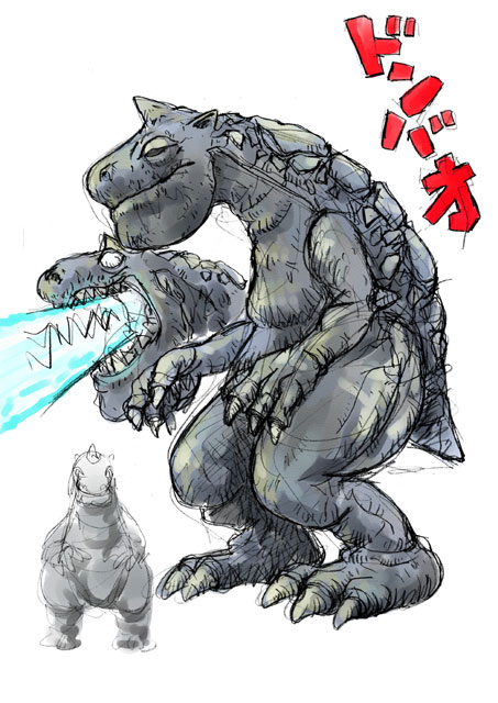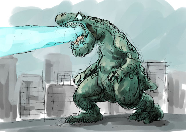 光線を吐く怪獣。手持ち無沙汰で背景に適当なビルを描いてしまったが、こういうシーンの時は必ず手前に建物を置きたい。何故か。足元が見えると巨大感がなくなるからです。怪獣の足だけでなく、地面が見えるのがよくない。殆どの場合地面が水平なのでリアリティにかけるのだ。じゃ、でこぼこや勾配をつけたら解決するかというと、模型としては解決しても着ぐるみが歩くことを考慮すると出来るだけ水平で均された地面を選んでしまうのでした。地面と足がはっきり見える視点はかなり近づくか俯瞰で無いと見れない。その視点は人の背の高さで一般的に見れない視点なので、嘘の生き物が更に嘘に見えてしまうので、予算が限られている場合は避けたい視点なのであった。