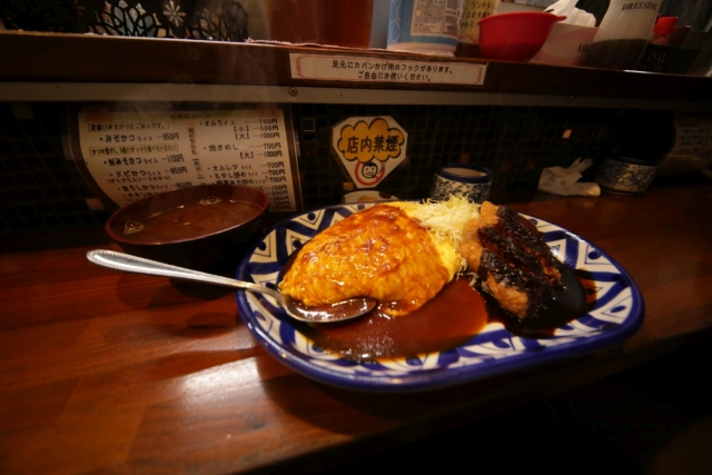 一楽だったか、みそカツで名が知られるお店でオムライスと味噌カツのコンボを頂く。1,100円。写真が妙に広角なのは広角レンズがついているカメラしか手元になかったから。