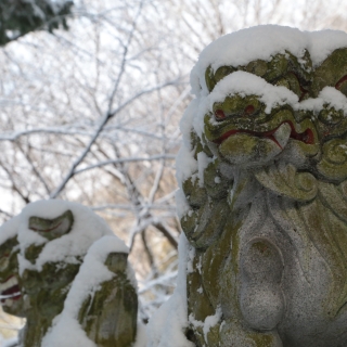 第一狛犬。雪が降っていたときの風向きが分かりやすい。