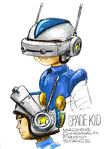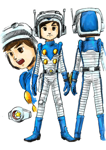 主人公の宇宙キッドのスケッチ。怪獣図鑑と大きく違うのはヘルメットのバイザーだ。今回はゴーグルになるようにしている。劇中での見た目の変化をつけたいことと、模型化する際にクリアパーツは色々面倒なんだよ。アニメにするのに模型化とは意味が分からないが、模型化も考慮に入れたデザインにしていきたいのだね。何故かと問うならば、そういう遊びなんだよ。耳の部分とベルトも変えていて、星マークの扱いを変えました。以前は透明感のある星型をめり込ませていて、今回は円形のへこみの中に星型が浮かんでいるデザインになってる。その割には未だ適当感があるなあ。もっと詰めていこう。