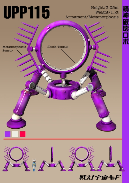 精神破壊ロボは架空のTVアニメ、宇宙キッドの第三部の通し話数の第29話「叫ぶ機械」に登場する敵メカ。体の中心の輪から地球人に有害な電波を発信すると云う設定。