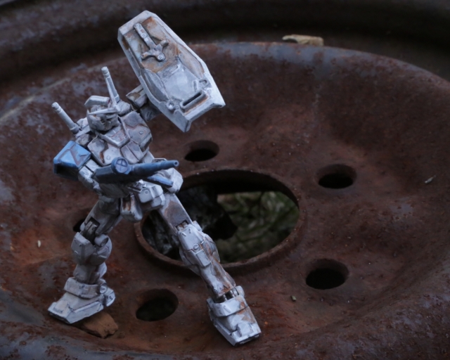 毎度汚いが、脚に軽く被弾しているとかなんとか適当な屁理屈のもとに汚している。ガンダムは白いモビルスーツと言われているので白く塗った。ちょっと色がついていないと寂しく感じたので右肩だけ青くした。