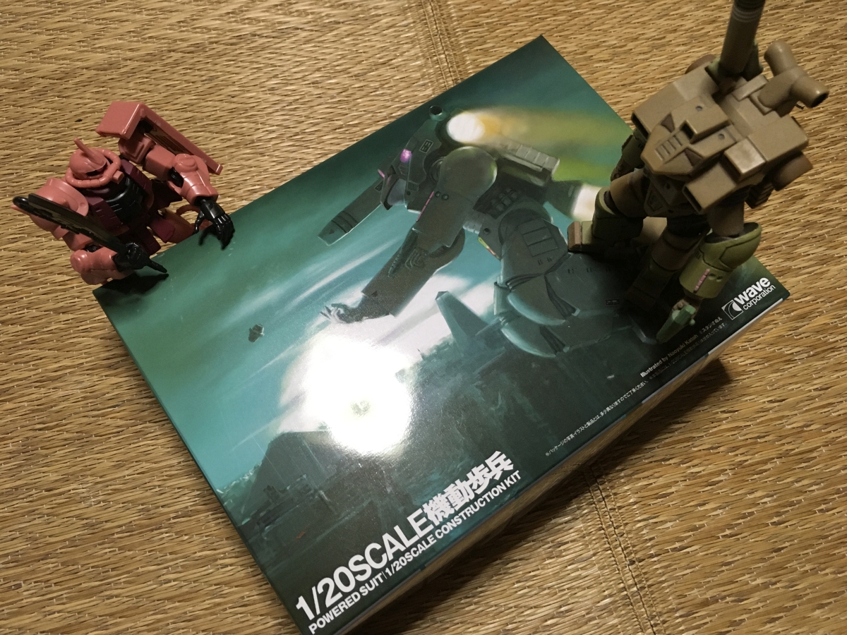 WAVE製1/20機動歩兵。横のザクは食玩のGフレームシリーズ.。箱の上に乗っているのは海洋堂製のアクションフィギュア、1/24パワードスーツ(機動歩兵).。