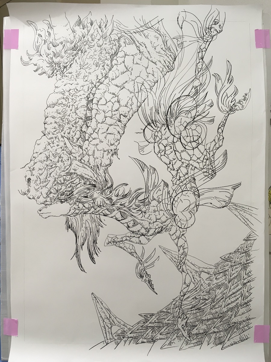 日記 20240921livedrawing. 投稿者: murbo 投稿日: 2024/09/232024/09/23 まあぼん21で毎週土曜にライブドローイングをやっているのですが、今回は鉛筆とネタを描いたスケッチブックを忘れてしまったので、下書きなしで本当にライブで絵を描くことになりました。 何を描くかはある程度覚えていたので思い出しつつ描きます。 麒麟の体がどっちにどうやって向いているかわけがわからなくなりました。なんでこんなポーズにしたのか自分でも謎です。 緩めに時間をとって二時間くらいでできました。とりあえずお腹が減りました。 関連記事: 20240921livedrawing2. まあぼん、森のギャラリー版7月6日に描いた。1 黄龍2220718