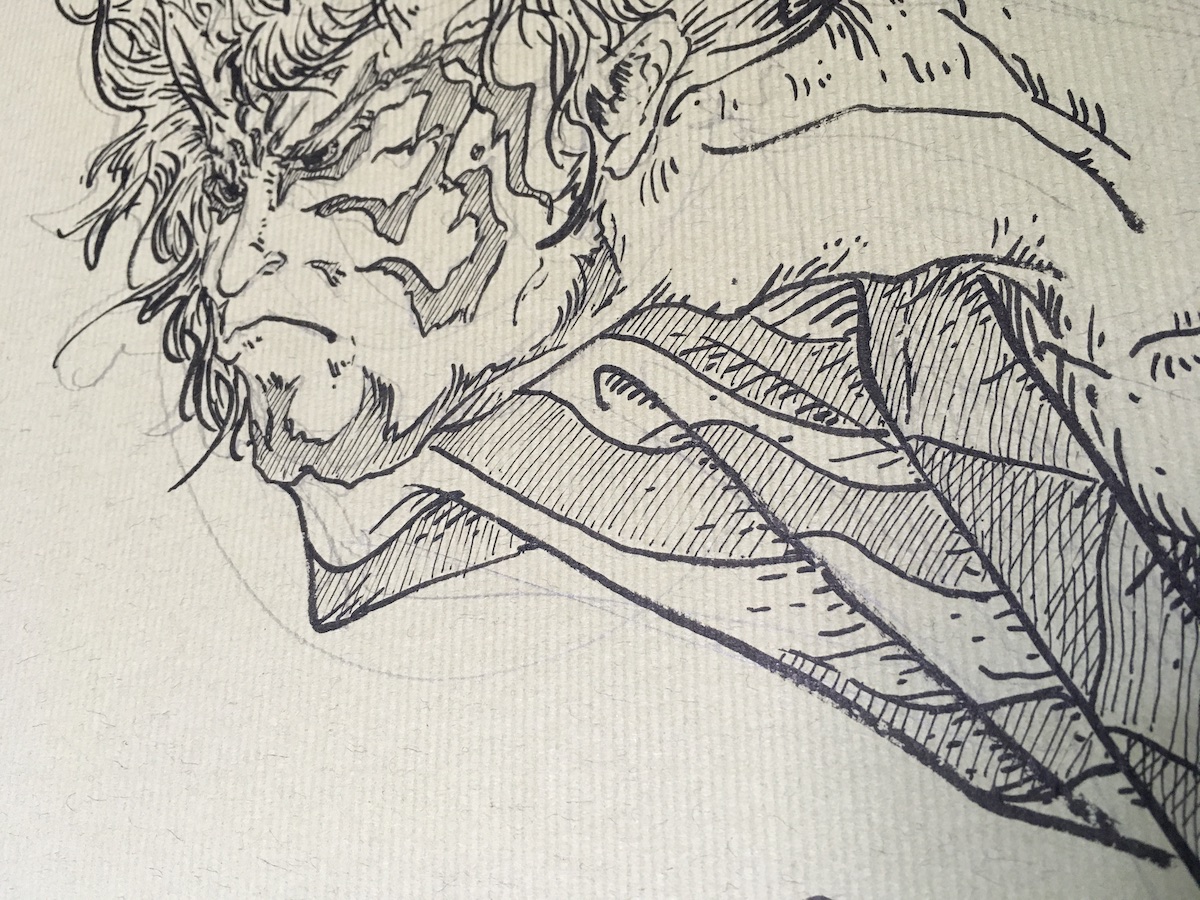 ペンで描いているのは同じ墨汁で描きたいからで、細くて均一な線がかければつけペンでなくても良いです。ボールペンで描いていたこともありますが、インクの色や光沢が違うので印刷ならともかく原画を見せるとなると一体感がないのは嫌だなと思ったのです。