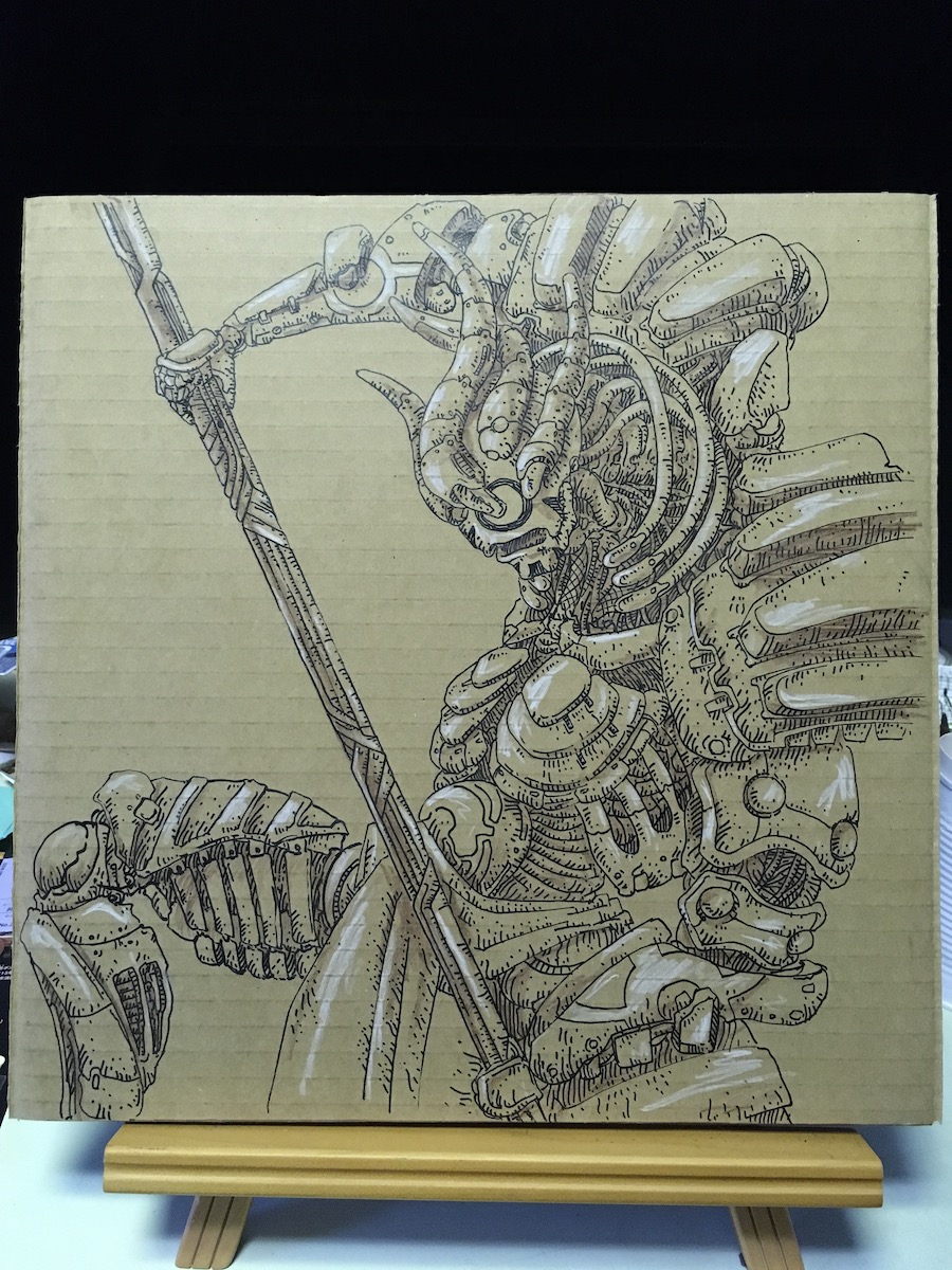 細かい書き込みはガラスペンで描こうとしていましたが、僕には描きづらくて、そんなに細かい線がかけるわけでもなかったので、そのまま竹ペンで描いて、ハイライトとシャドウを色鉛筆にしました。