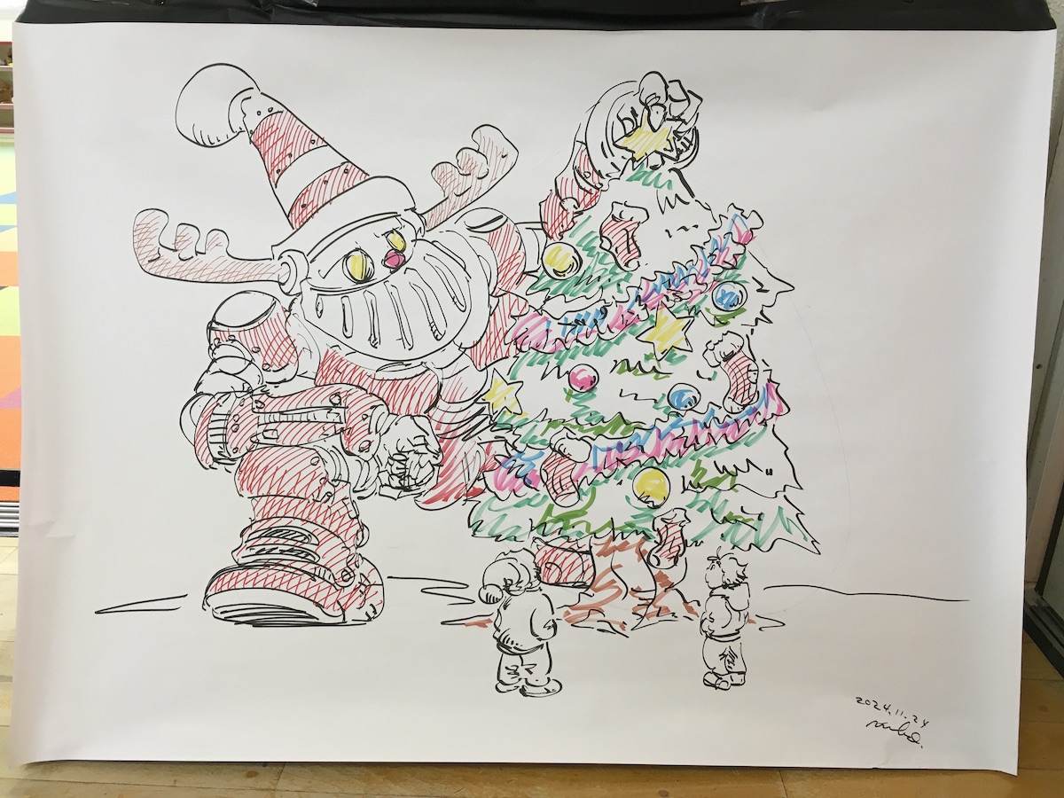 毎月継続している児童センターでのライブドローイングと似顔絵。サイズはB全くらいかな?あつらえてもらったものに描いているので割と無頓着です。今回は色で描いているので少々時間がかかって30分くらいかな。もっと短時間で描いていると思いたい。子供たちが見ていることを前提にしているのでできるだけ短時間で何を描いているか当てっこしてもらうようにしています。この当てっこのゲームバランスが難しく、簡単すぎても楽しみが薄いし、難しくてわからないと興味を失うので毎回苦労しています。