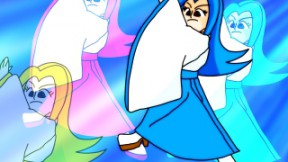 青い髪の満月やすらの技を出す直前の周囲からモノトーンのやすらが集まってくるのは仮面ライダーディケイドの変身のパロディーです。