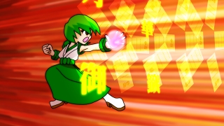 緑の髪の半月酔子の手からビームは、手からビームが出ること自体は使い古されてるのでパロディでもなんでもないです。出す直前の軌道をおみくじが囲む様は仮面ライダー ディケイドに登場する、仮面ライダー ディエンドの必殺技ディメンションシュートのパロディーです。