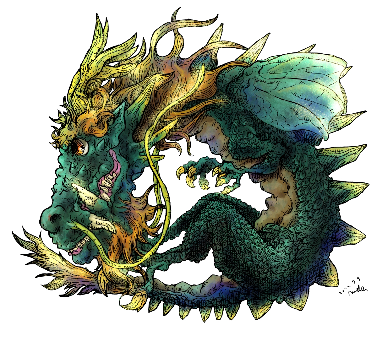 Picture 丸い竜。 投稿者: murbo 投稿日: 2022/08/152022/08/16 丸い竜とは、ディフォルメした龍が丸まっている様を描くはずだったが、体を人型に描いてしまったので単なる練習になってしまった。次はきちんと描きたい。 紙にマーカーでドローイング。Procreateで彩色。 関連記事: 帽子に描く。 金色の龍の練習。 inktober2019改題20。