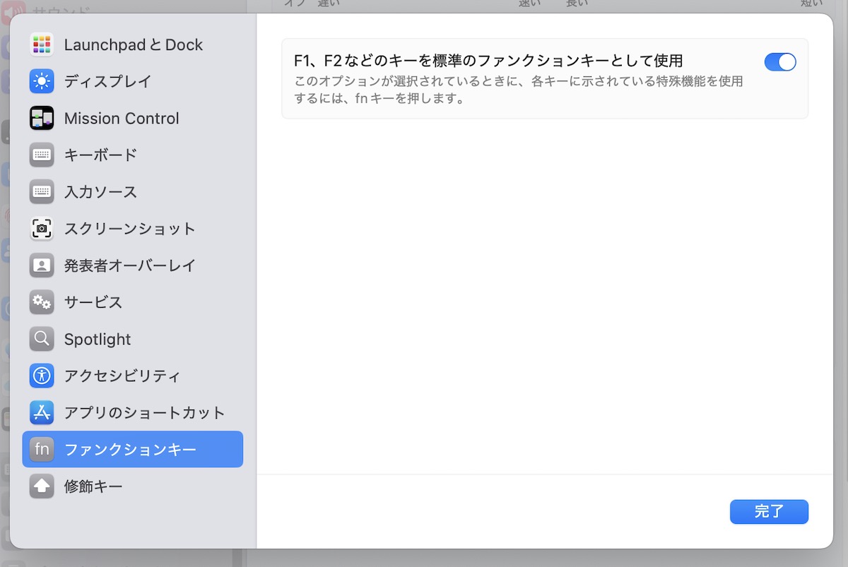 F1、F2などのキーを標準のファンクションキーとして使用をオンにするだけ。