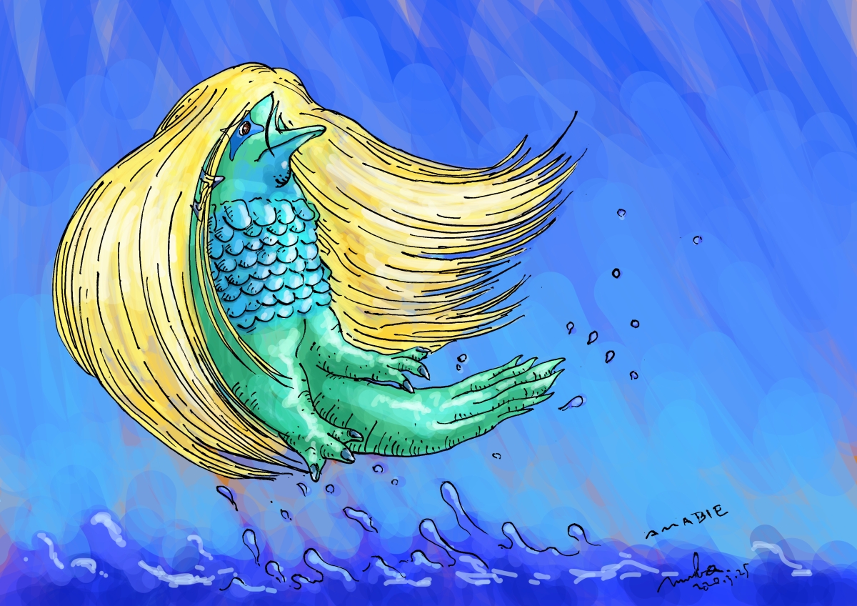 アマビエは妖怪で怪獣でも怪人でもないが、似たような感じなので時流に乗ろうと思ってやっと描いた。ちょっと時間取れないままだったし、かと言ってそれを言い訳にして描かないのも良くないし、しかし久しぶりにつけペンで書いたらペン先が全然インクがつかなくて描きづらかった。もっとペンで描かないとな。色を塗っているProcreateもメモリが足りないのかたまに落ちてデータが破壊することがある。シンセサイザーなど単に好みでインストールしているものを削除した方がいいかもしれないな。脚は三本のようだったが二足としっぽのようなものに変更した。泳ぐときに太いしっぽを使う。手がないようだったのでそのままとしている。
