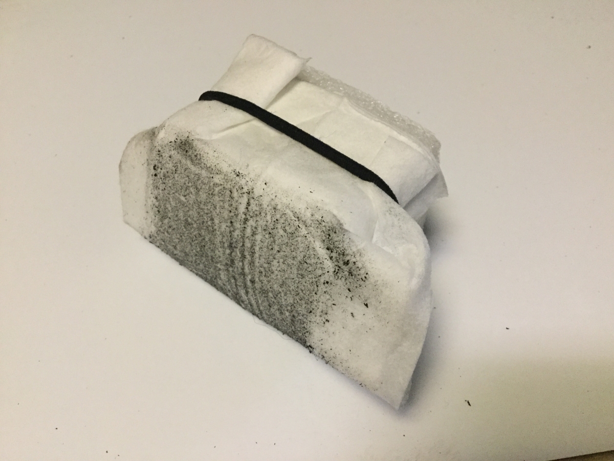 その辺にあったスポンジ的なものを不織布でくるむことでほぼ完成形になった。固定するのに輪ゴムなのは暫定措置。不織布でだけで拭いても事足りそうだけどクッションがあるととても消しやすくなるんだよ。比較的取り換えやすいために輪ゴムで止めることも見た目は悪いが使い勝手が良いためにずぼらになってしまっているな。スポンジ的なものも、的であってスポンジじゃない。固めのスポンジのような発砲素材でこれは何だろうね。よくある緩衝材だと思うんだけど、硬さとしてはメラミンスポンジくらい。