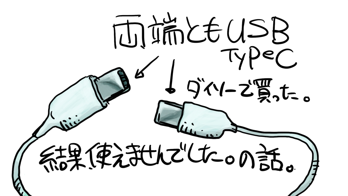 日記 両端ともUSB Type-Cケーブル 投稿者: murbo 投稿日: 2020/10/172020/10/17 ジンバル用に両端ともUSB Type-Cケーブルが欲しくてダイソーに買いに行きました。付属尾ケーブルはやたら短くてぎりぎり距離が足りている状態なのでできればもう少し余裕が欲しかったのです。アマゾンで探したらやや高かったのでダイソーに行ったのです。 1mでは今度は長いのですけど、余裕があるのは精神的に楽です。楽だったのは繋いだところまでで、このケーブルでは理由はわからないけど通信できないようで使えませんでした。結局ギリギリ届くケーブルを使うことになりました。リンクはamazon。 関連記事: Fire7が充電できないが解決した。 描いたら塗っている練習 どうかしている広告会社(一人親方)たち。
