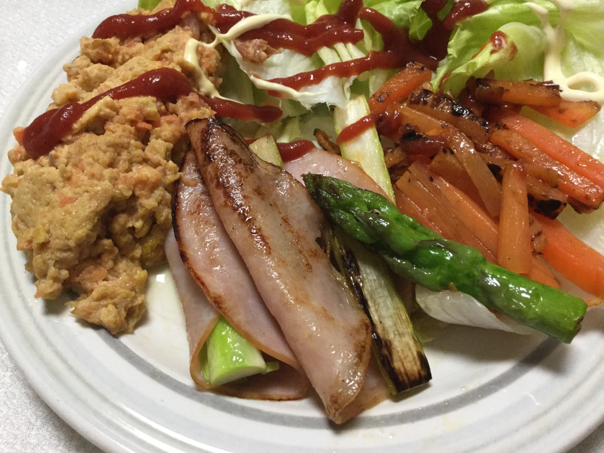 毎度変わりばえなく、アスパラと人参尽くし。そう見えていないのはアスパラガスはハムに隠れ、人参は卵焼きに内蔵されているからです。きょうの失敗はアスパラを巻いたときに楊枝などで留めなかったことと、オムレツに入れた人参の量が多かったことです。人参はすりおろしています。オムレツに人参を入れるのはしばらく挑戦します。アスパラも我社の庭でめちゃくちゃ成長しているので消費が追いつかなく、こちらもしばらく続きます。