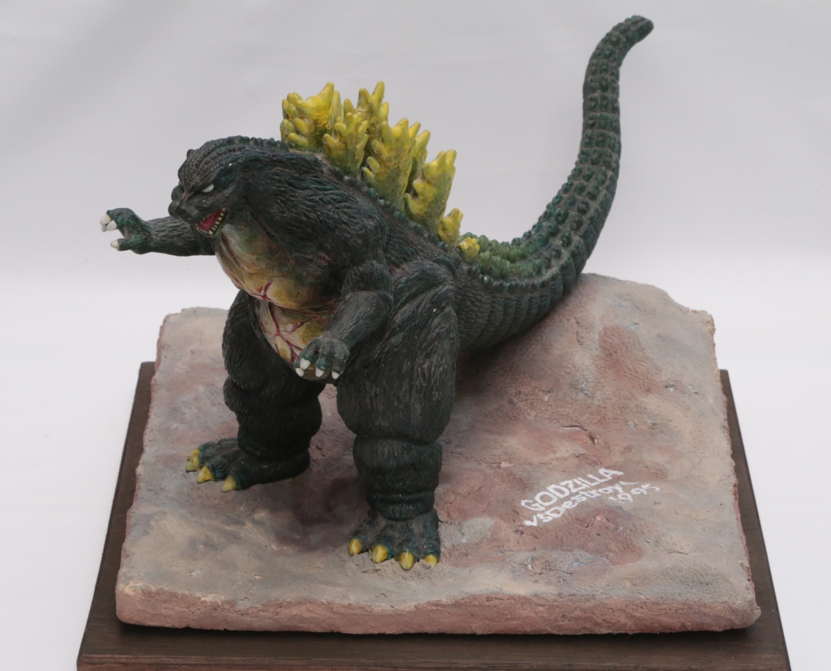 地面を仕上げてからベースに接着したので木かる粘土の収縮で反った部分は強引に接着しても効果はなく、反ったままになってしまった。乾燥してから削って調整すべきだったな。それか一つ前に作ったドムトローペンやゴジラ1984みたいにベースに接着してから地面の作成をした方が良かったな。その場合はベースにマスキングを忘れずに。