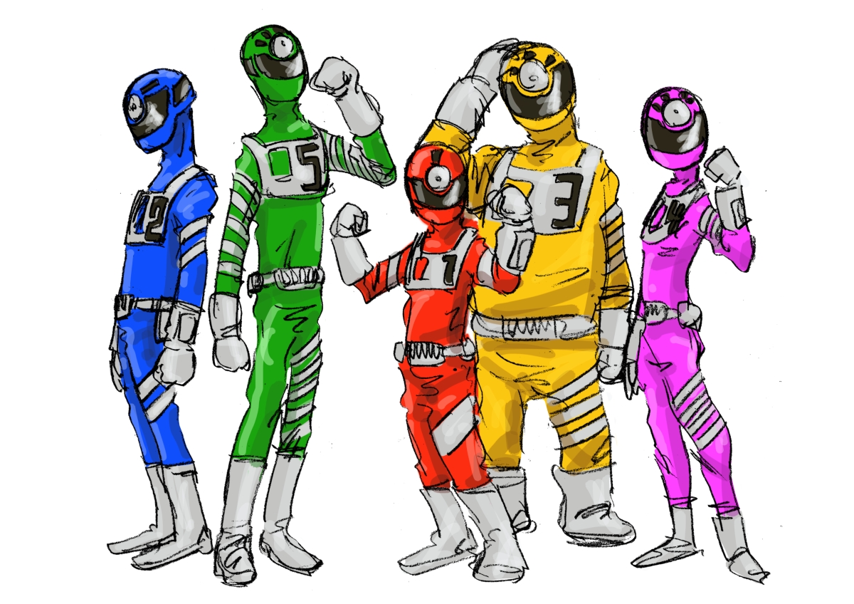 毎度のことく以前描いたものを見ていないので色々違うところがあるのは忘れていいるから。それぞれは適当な方向を向いているわけではなく、立っている場所も含めて性格などを表している。バイトレッドが小さすぎたな。今の戦隊だとデブがいなくて黄色が女子でピンクに女子を割り当てることは少なくなってるみたいだね。原点の分かりやすいビジュアルによるキャラクター表現にしたいと思ったのでこのような格好になっています。