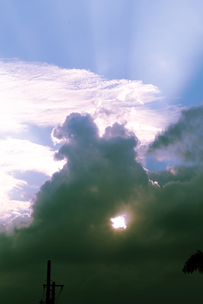 Photo くも。 投稿者: murbo 投稿日: 2021/07/302021/07/30 binary comment 風神雷神図のスケッチができたし、ちょうど雷雨がやんで虹が出そうだから絵を持って撮りに行こうと自分ではやらないことをやってきました。虹はうっすら出ていましたがシャッターは押しても保存をしなかったので撮影できていないのと同じことになりまして、反対の空を見ると陽を遮る雲がいい味出していたので撮りました。King of Monstersの横顔のようです。 関連記事: 河津桜とか。 今日の花。雨降ってます。 紫陽花の近況