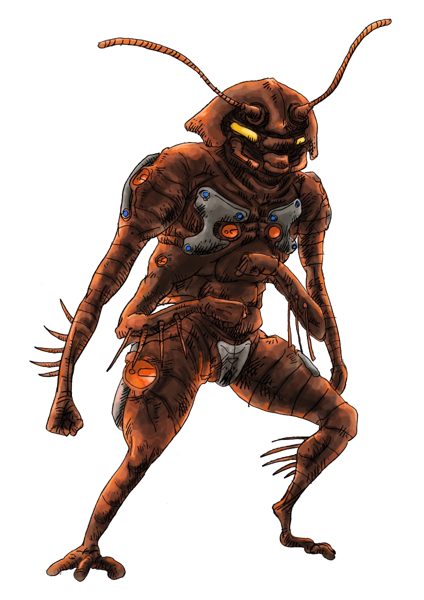 久しぶりの昆虫怪人なのでどうやって良いかわからなくなっていました。とりあえず腕4本は気にしていたのですが、リキッドメタル(と言う名前の金属パーツ)とエナジーバルブ(という名称にしたオレンジの丸いやつ)の配置がもやっとしたままだ。その上、寝ぼけて描いていたのであちこち書損じがある。ヌルっとした艶も出すべきだったなあ。ゴキブリが嫌いな人が無言でウィンドウを閉じる。そこまで描かないとな。そのうち描き直すのでその時にちゃんとしようと思います。
