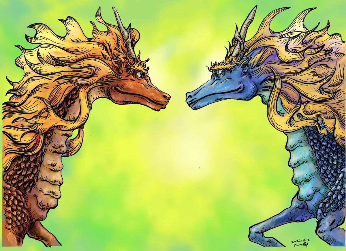 ドローイングは先に描いた龍と同じ筆ペンとボールペン。