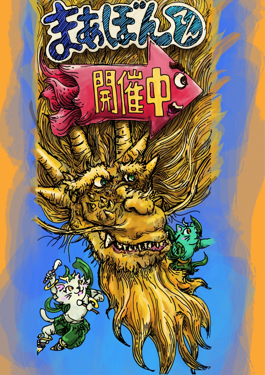 まあぼん まあぼん、の看板に彩色。 投稿者: murbo 投稿日: 2022/04/182022/06/03 会場の看板用にボワイドボードに手書きしたのですが、事情があって使えなくなり、なのにまだ消していないのですけどもw。それでなくともいずれ消すことになるので撮影して彩色しました。 ホワイトボードにホワイトボード用マーカーでドローイングにProcreateで彩色。 関連記事: もうひとつのまあぼん、の看板に彩色。 まあぼん、もりのギャラリー版の看板に彩色。 ドライブインギャラリー