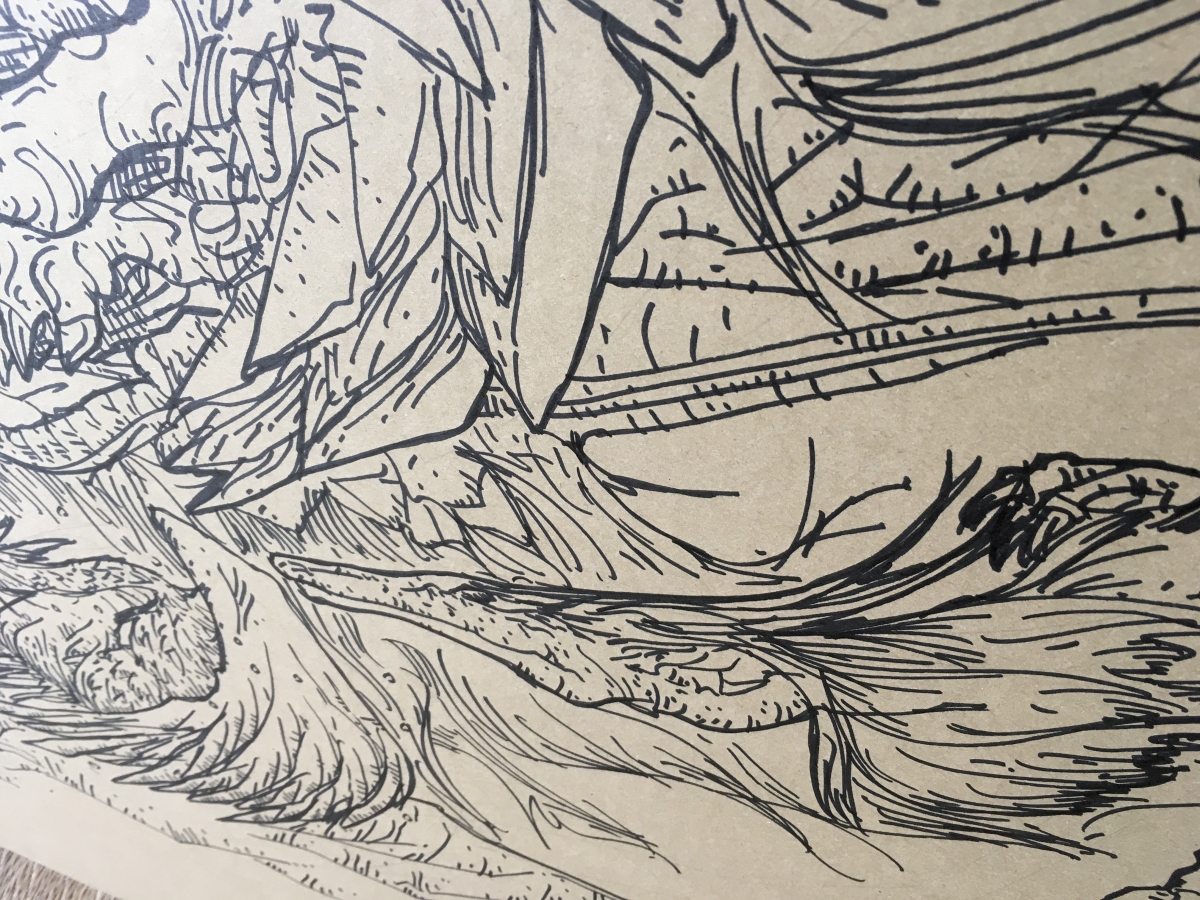 Picture 続、箱に描く。 投稿者: murbo 投稿日: 2023/09/152023/09/15 移動用の箱に描くの続き。反対側に描いただけです。最近下書きなしや大きい絵を描いていないので練習に描きました。全体はそのうち別の場所で公開するかもしれないです。公開できなかったらここで公開するでしょう。久しぶりにマーカーを入れたケースを開けたら密閉度が高くてシンナーがめちゃくちゃ臭った。描いている間もかなりシンナー臭くて保存ケースとしての性能は高いことは再確認させられた。 段ボールに油性マーカー。 関連記事: 2023年10月20日に描いた件。 Dr.dragon 2023年7月3日の制作。