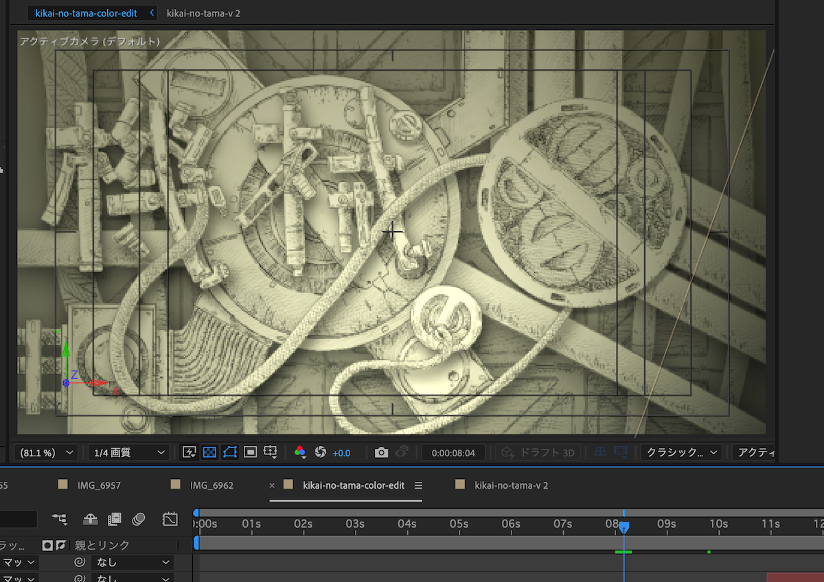 Picture 2023年8月22日の制作。 投稿者: murbo 投稿日: 2023/08/222023/08/24 制作中。3Dレイヤーでの重なり具合が要領を得ず、相当な力技で解決しています。オーバーレイしている色を後から載せたりです。ということで、いまだに曲がないので作ります。 関連記事: 2023年8月21日の制作。 機械の珠のタイトル映像。 2023年8月23日の制作。