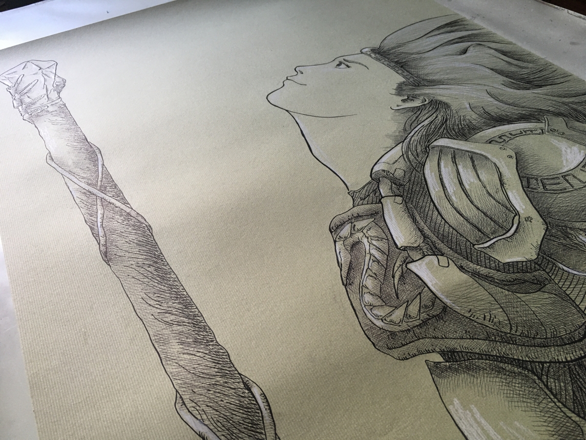 今回から筆ペンを筆に変更しました。が、いただきもののとはいえ、いくつかあった筆がほぼ使えず、行けると見込んだこともあって結構がっかりで、これで絵は完全に無理で文字なら書けたのかな?そういうものでもないと思うんだけど、まぁ一般的に文字も絵もかくには相当辛い状態の筆で、その中でも何とか描ける筆で描いています。それでも筆ペンより太さの変化がつけられるので出来るだけ筆で描きたいのだよ。