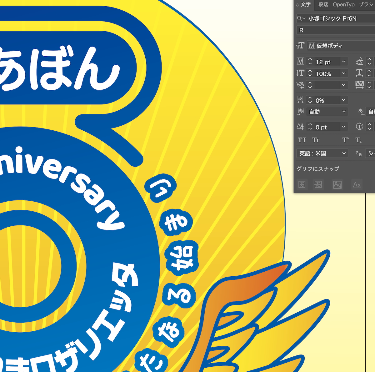 なんとなくイメージカラー的になっている黄色と青色で相方が決めたタイトルを盛り込んでいます。5周年の漢字がゴツく感じたので英語に変えて文字を組んでいます。文字数があるのでコンパクトに一覧できることを考えて作っています。大きい5は都合よく文字を中に並べられる書体が見つからなかったので自作しました。フォントはありものです。羽も描いたね。羽はまあぼんで最初に描いたのが二人が乗っている鳳凰だったので初心を忘れないようにその羽です。